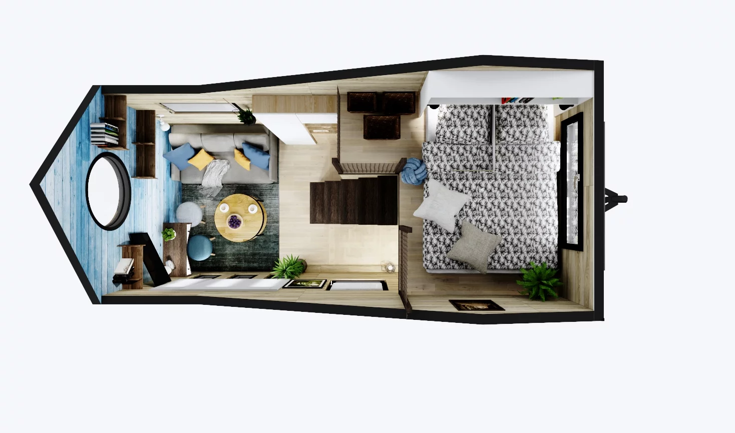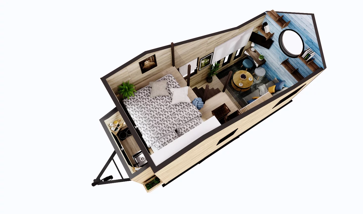 VOYAGER to ciekawy projekt z niekonwencjonalnym układem. Domek charakteryzuje się współczesną stylistyką, jest mały ale dobrze ukształtowany i pozwala zaoszczędzić dużo miejsca. Przy długości zaledwie 6 m mieści się salon z rozkładaną kanapą, biurkiem i półkami. Kuchnia jest przestronna, wygodna i w pełni wyposażona, jest w niej kilka szafek, szuflad i wystarczająco dużo miejsca na blat do przygotowania posiłków. Na zewnątrz domek ma wbudowane pojemniki do uprawy roślin.