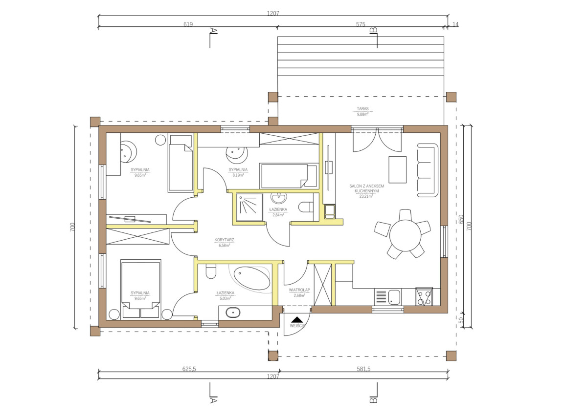 Projekt można modyfikować – zmieniać wielkość pomieszczeń oraz powierzchnię użytkową domu.